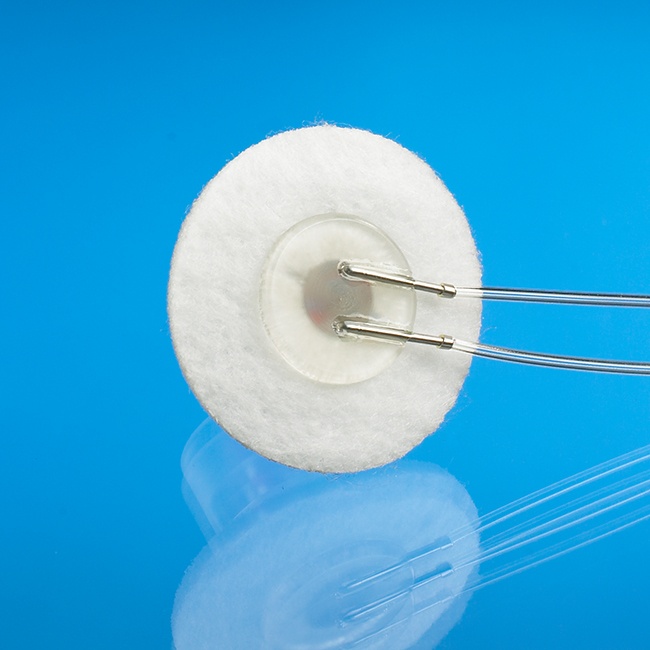 这种可植入纽扣含有三个单独灌流通道,通过与相应的系绳简单连接使用。它与单通道、双通道的大鼠纽扣式马甲大小相同,在纽扣的毛毡底端为22ga的针口,分别与三根3Fr管路相连。
